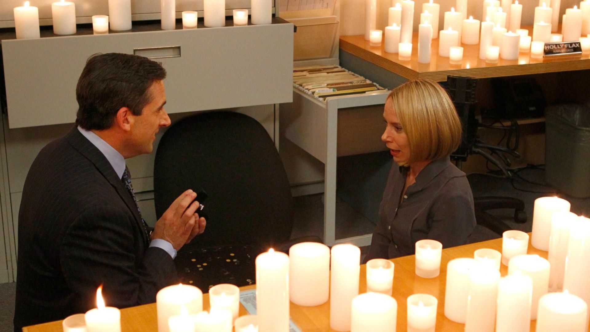 המשרד 7 - פרק 19 מכירת החצר הראשונה בהיסטוריה של המשרד מתקיים במחסן. מייקל מציע להולי (איימי ריאן, "נראתה לאחרונה", בתפקיד אורח) נישואין.