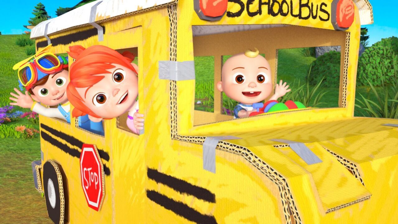 טופי וחברים החיות יושבות באוטובוס והילדים משחקים בכדור.